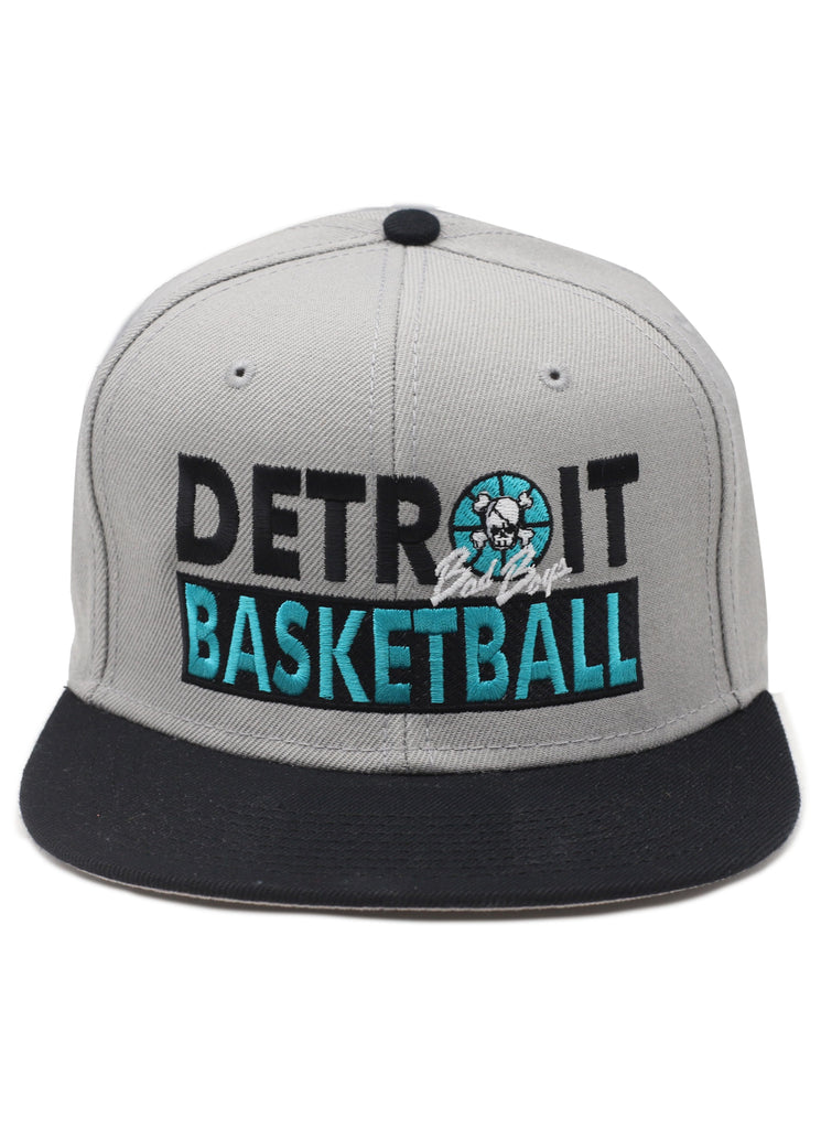 Detroit Bad Boys Flat Bill Light Grey/Black Bill with Snapback Cap, 80% acrylic, 20% wool; 6 -panel structured, high profile, flat visor, adjustable plastic closure, embroidered logo on front.
