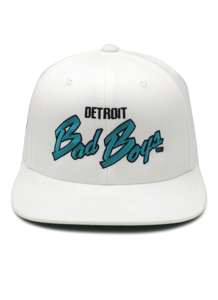 Detroit Bad Boys Flat Bill White with Script Teal and side logo